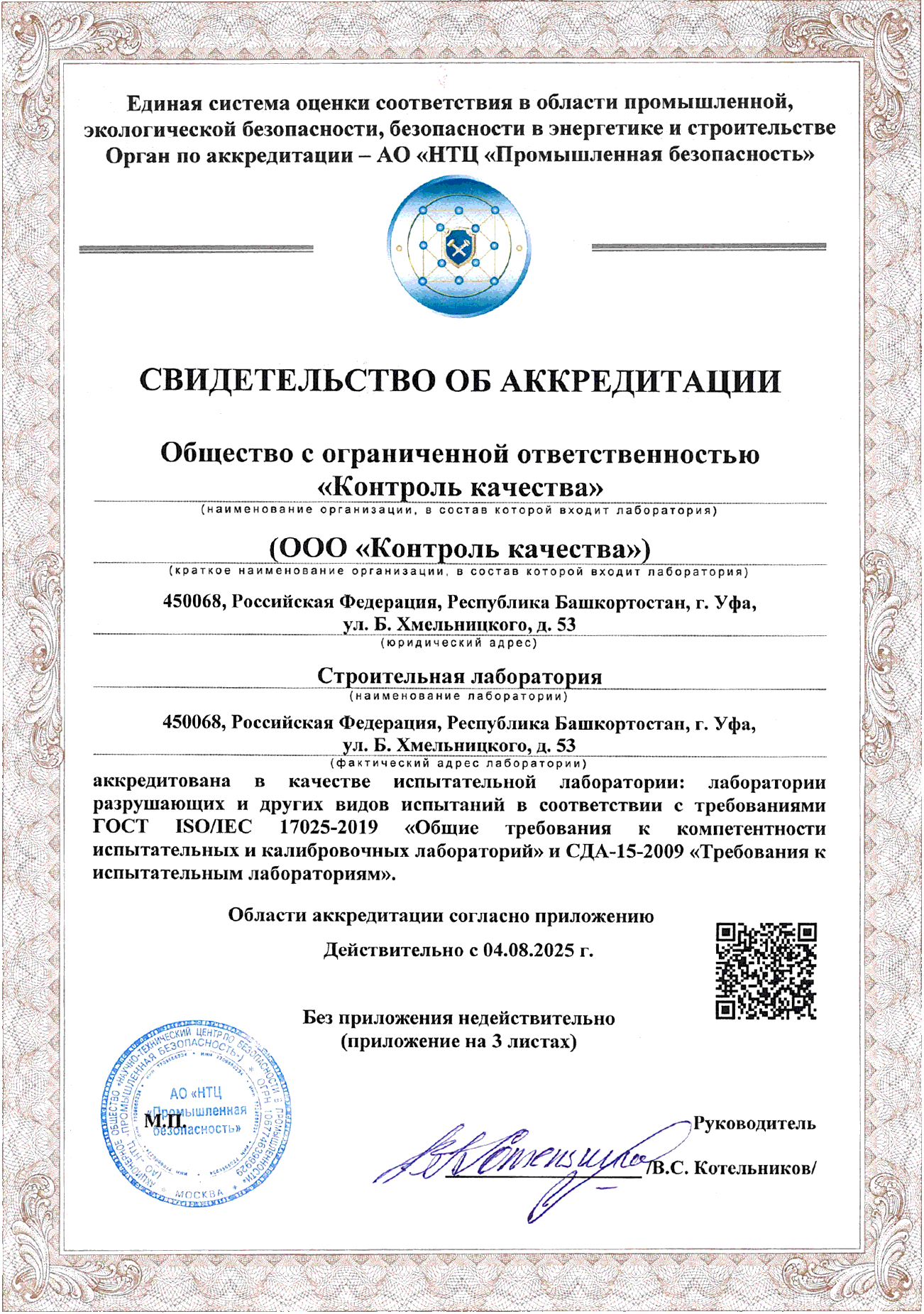Quality Control 7 (ООО «Контроль качества») — аккредитованная строительная лаборатория в Уфе, оказывающая услуги по испытанию строительных материалов и конструкций для застройщиков, подрядчиков и производителей стройматериалов.